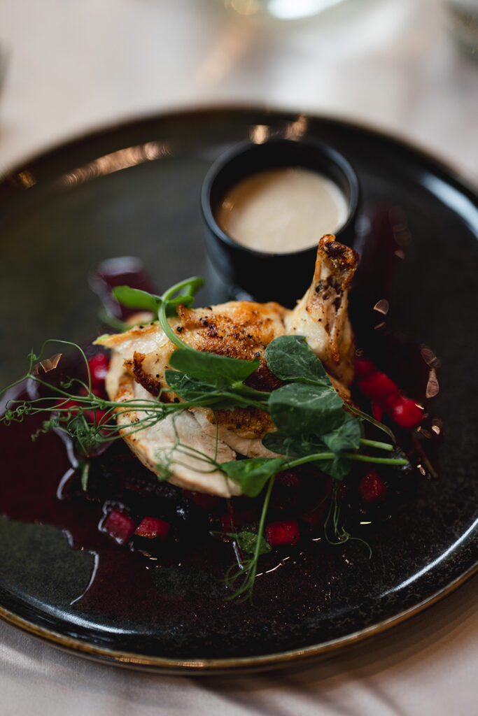 Supreme kanafilee, peedi-suvikõrvitsa-kirsstomati soe salat, sarapuupähklisiirup, balsamico, spinat, metseseenekaste
